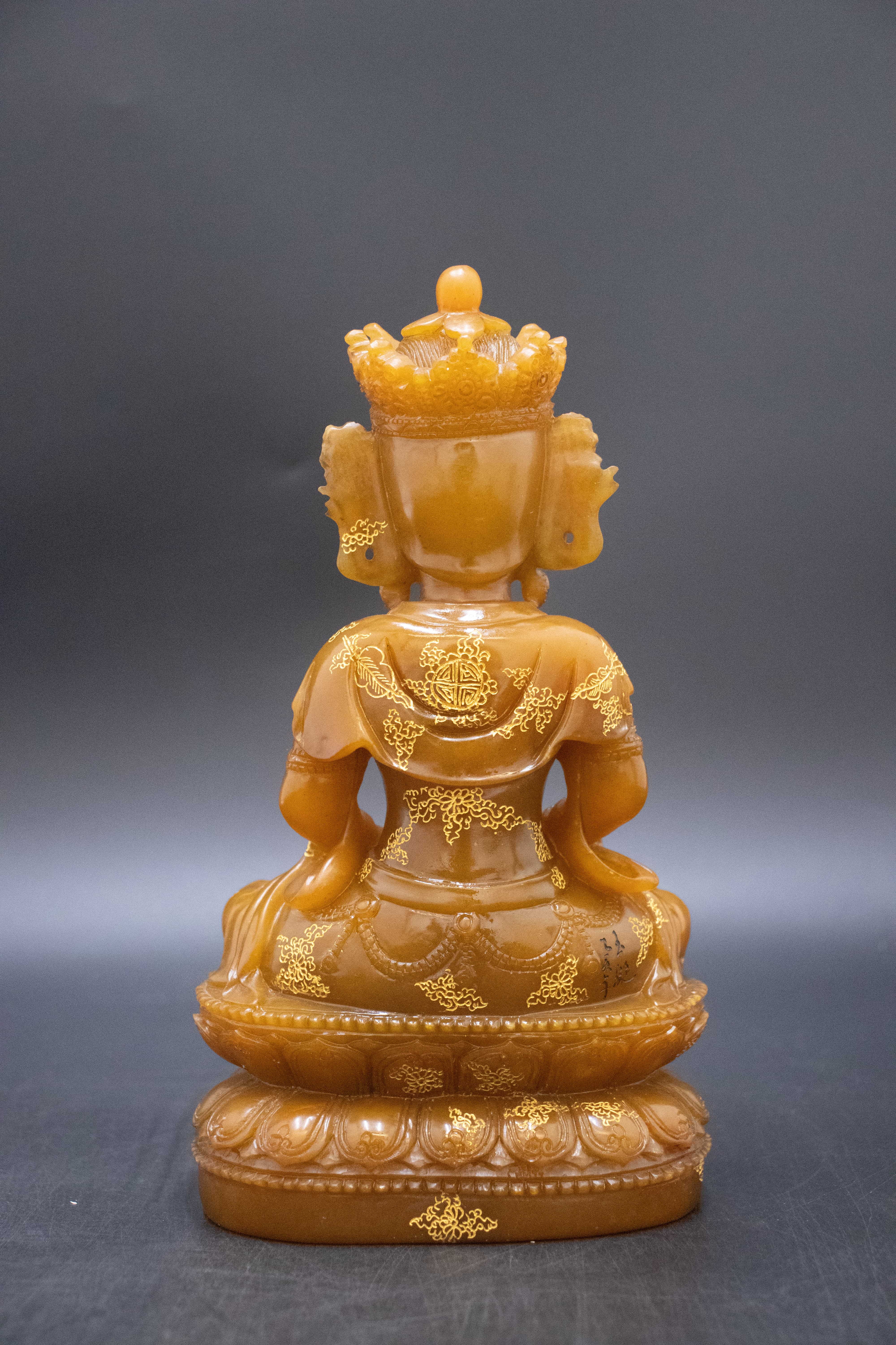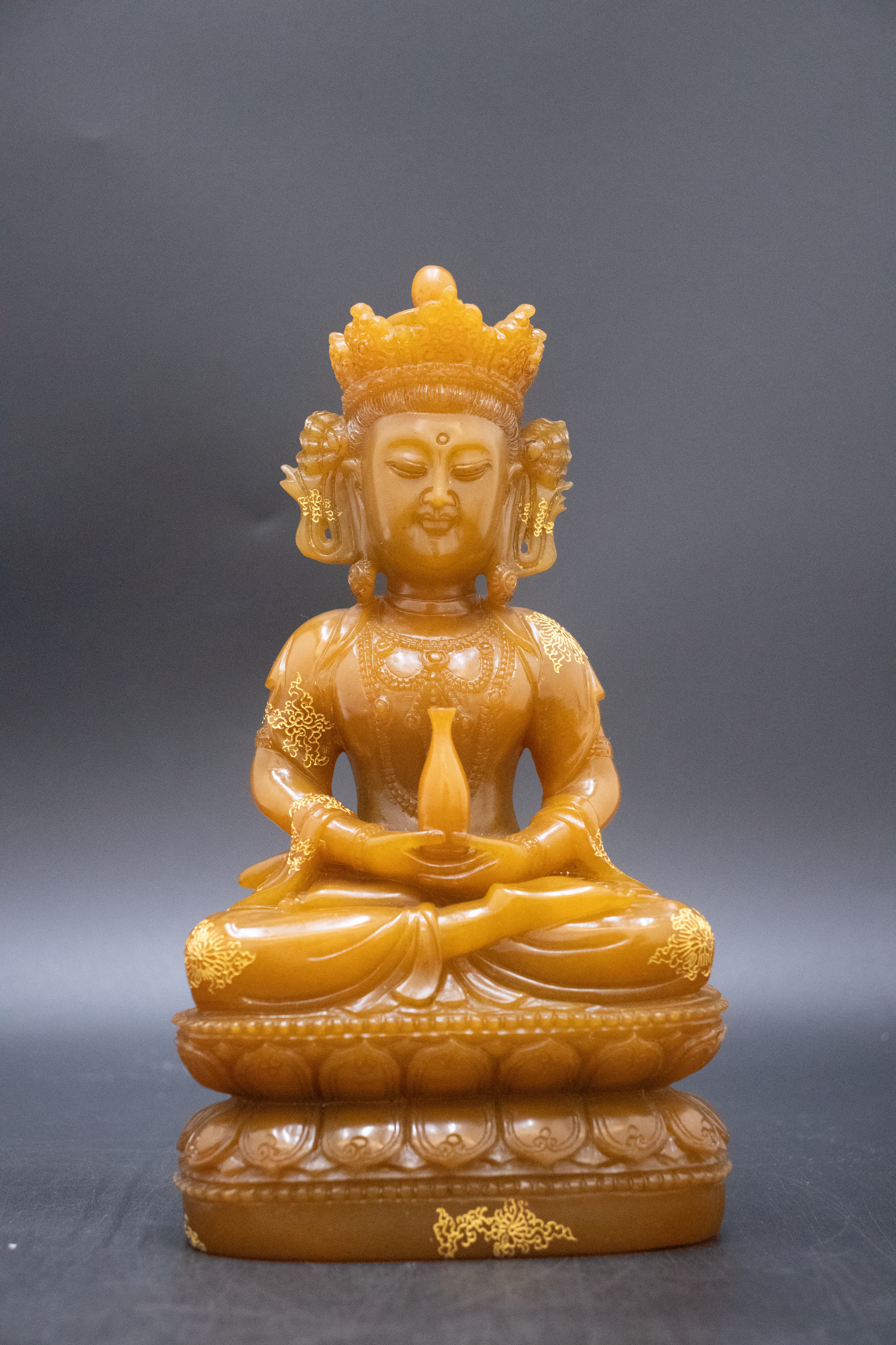 手工雕琢,工藝難度堪稱石雕界的“珠穆朗瑪”。匠人以刀為筆,在壽山石上精雕細(xì)琢:觀音寶冠紋飾繁復(fù)華麗,每一絲紋路都清晰立體;面部法相慈悲安詳,眉眼微垂間盡現(xiàn)菩薩“救苦救難”的悲憫;衣飾褶皺自然流暢,如真絲般垂墜靈動(dòng);蓮花座層疊有序,每一片蓮瓣都飽滿生動(dòng)。更點(diǎn)睛的是描金工藝,金粉在壽山石的映襯下熠熠生輝,于寶冠、衣紋、蓮座處勾勒出纏枝花卉等吉祥紋飾,讓造像在溫潤(rùn)之余更添華貴,盡顯“工必盡巧、料必盡精”的匠人精神,是當(dāng)代石雕工藝“形、神、藝”三者兼?zhèn)涞膸p峰體現(xiàn)。