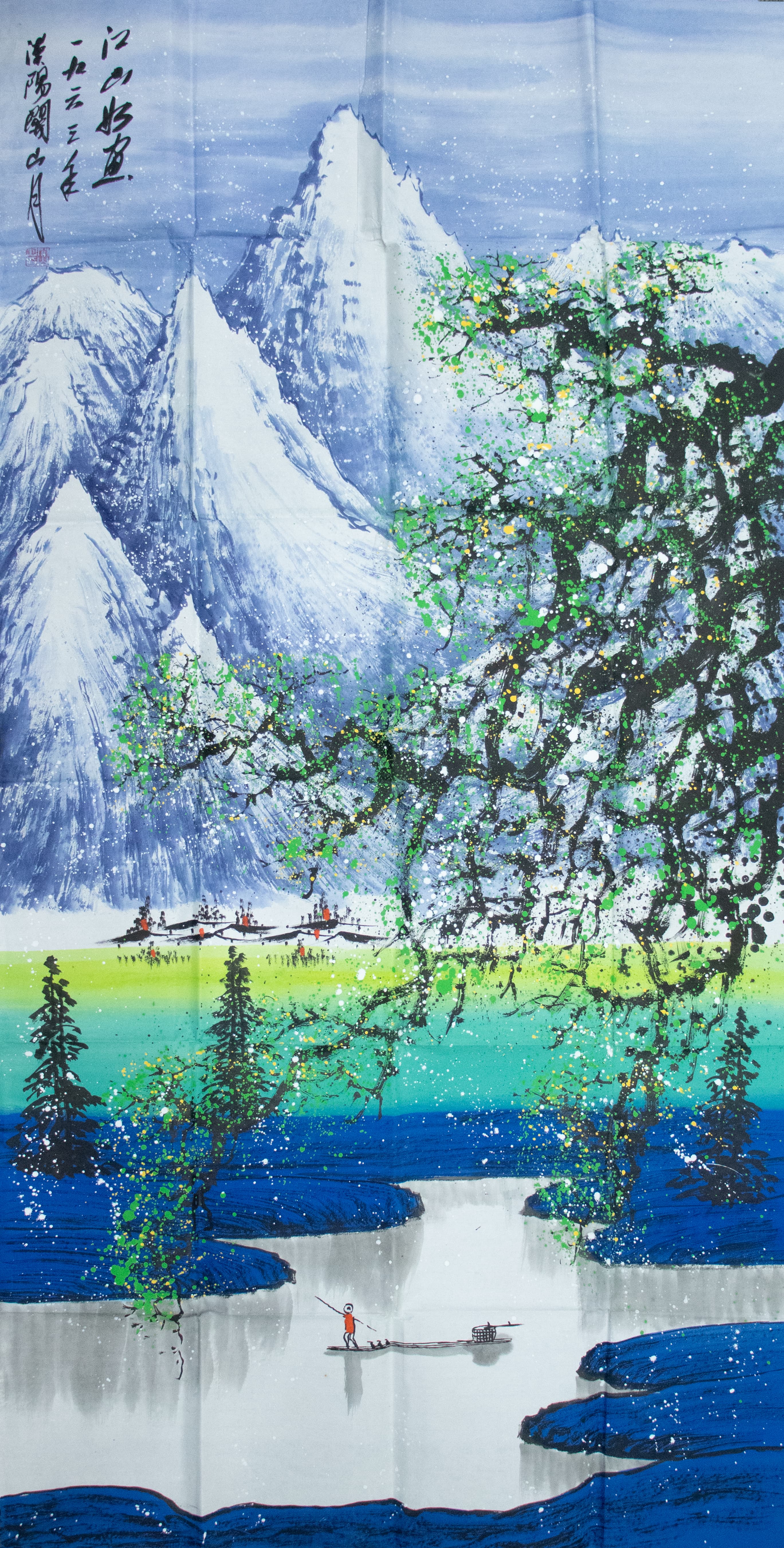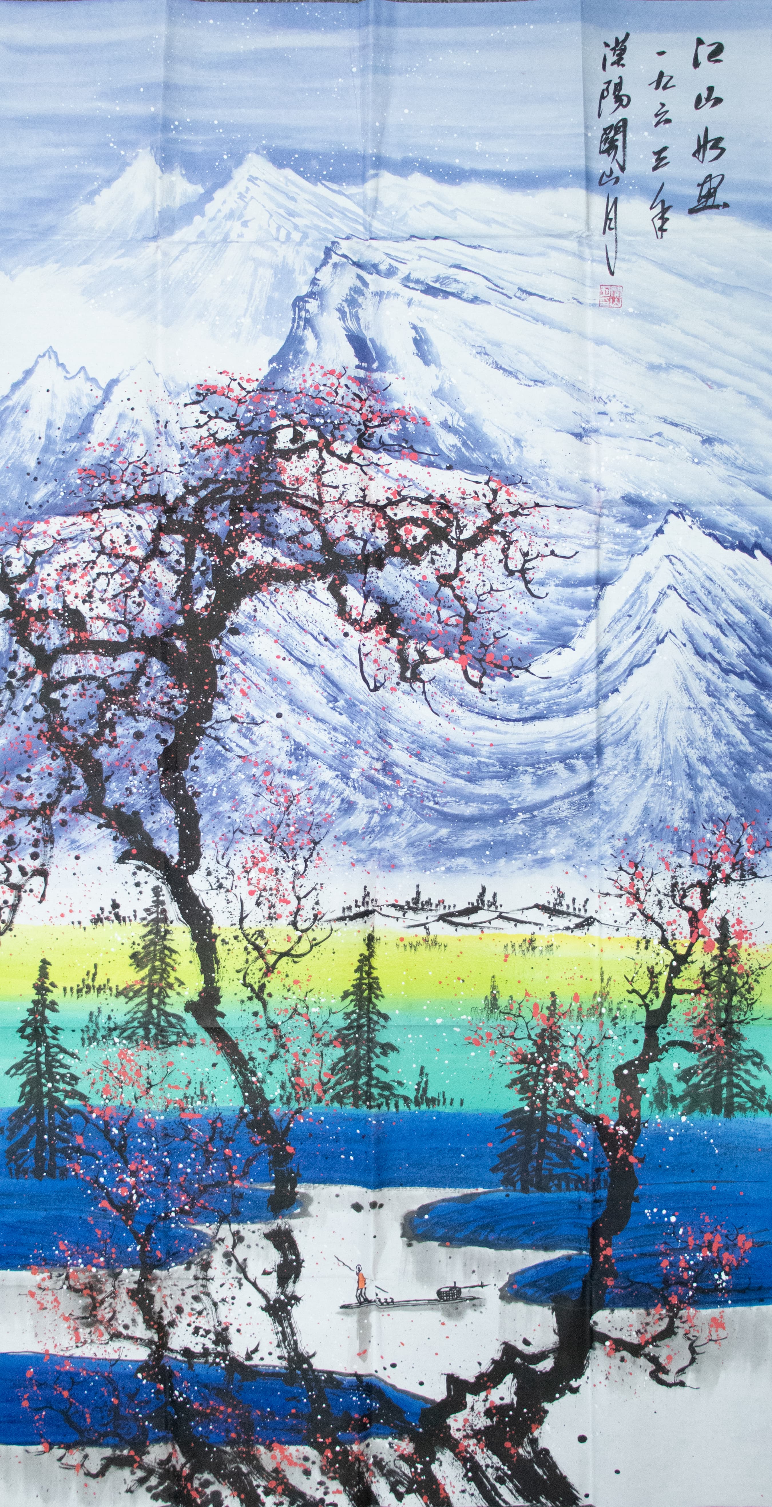 1965年恰是關(guān)山月藝術(shù)轉(zhuǎn)型的關(guān)鍵節(jié)點:他既承續(xù)《江山如此多嬌》(1959年與傅抱石合作)的宏大格局,又融入1964年雁門關(guān)寫生的生活積累——組畫中皚皚雪峰的雄渾、虬枝花樹的明艷,正是其“雪域壯游+春野生機”的視覺融合。兩幅作品以對稱構(gòu)圖呼應:一軸以蒼綠花樹襯藍白雪山,一軸以朱砂梅枝映雪域遠景,近景均繪孤舟漁人、隱現(xiàn)村寨,既保傳統(tǒng)山水的空靈,又以人間煙火氣錨定“時代山河”的敘事。