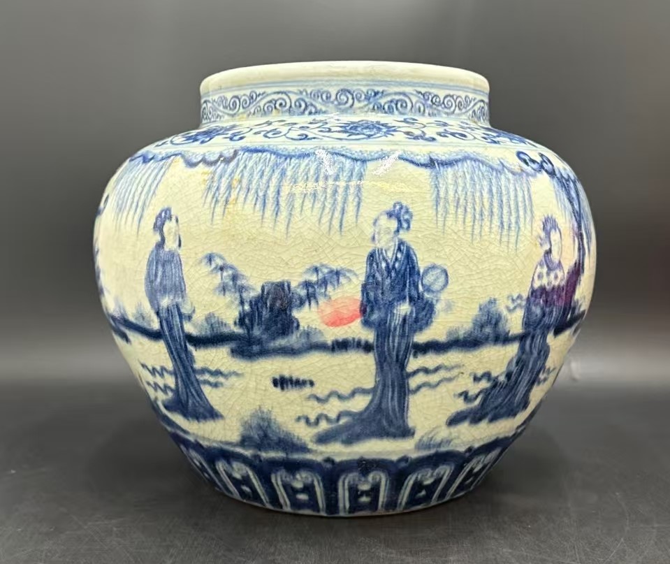 青花柳岸仕女紋罐 開(kāi)片裹韻 舊罐藏情