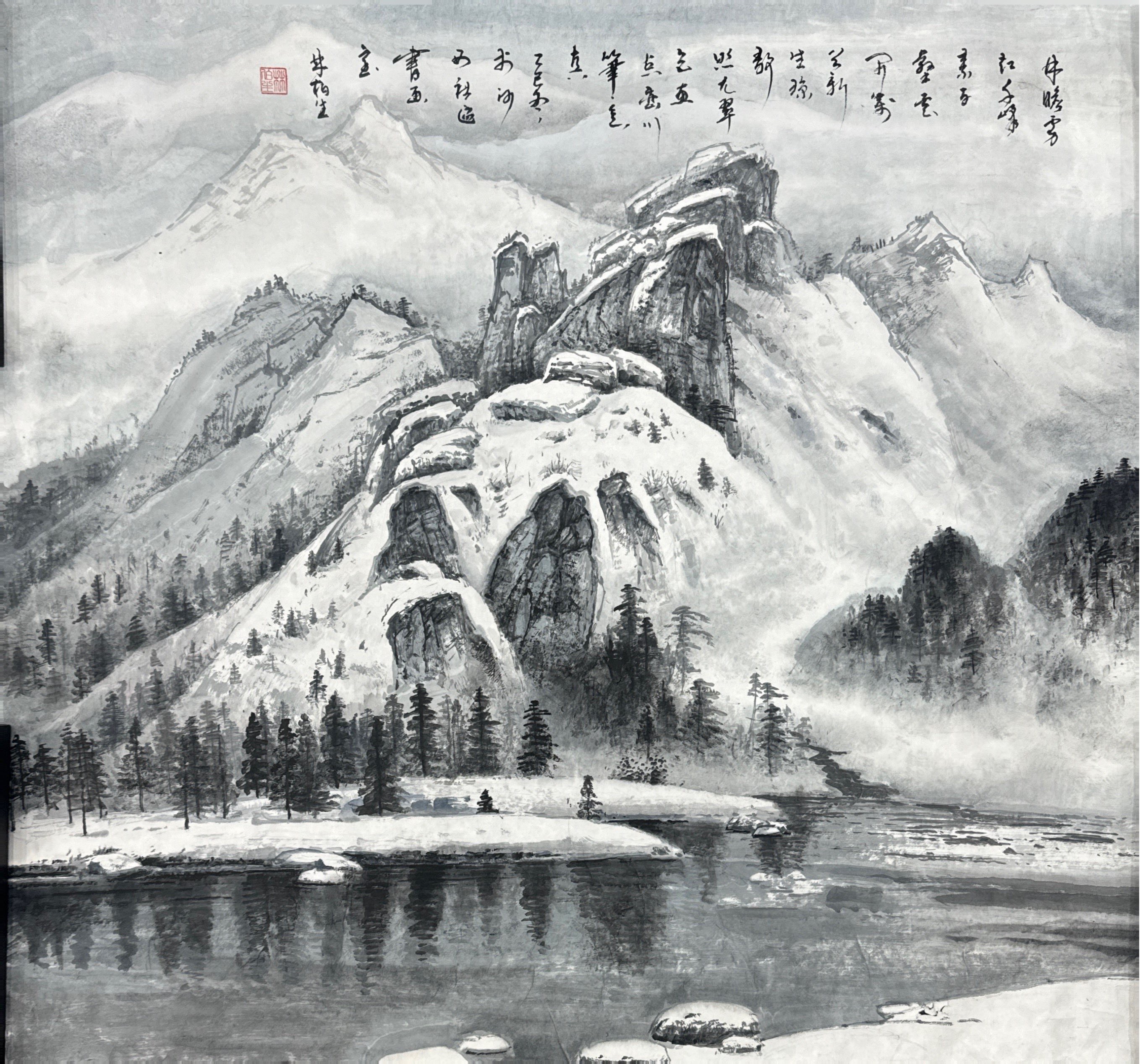在意境營造上,作品以“雪山清泉”為核心構(gòu)建出“冷寂中見生機”的氛圍:遠景雪山巍峨,墨色的濃淡層次營造出云霧繚繞的空靈感;中景巖石與林木的交錯,既展現(xiàn)出自然的野逸之趣,又通過積雪的留白與墨色的沉郁形成視覺對比;近景的清泉(水面)平靜如鏡,倒影與實景的呼應(yīng),讓畫面在“靜”中暗含“流”的動態(tài)感。題款“林曉雪 紅千峰 素百疊 疊云開 谷新 生韻 都九翠 立五川 點筆生 寫河 西社畫 主五 林伯生”以行書題于畫面上方,文字的韻律與山水的意境相互呼應(yīng),進一步強化了“詩畫交融”的文人審美,使作品既有自然山水的壯闊,又兼具文人畫的清雅。