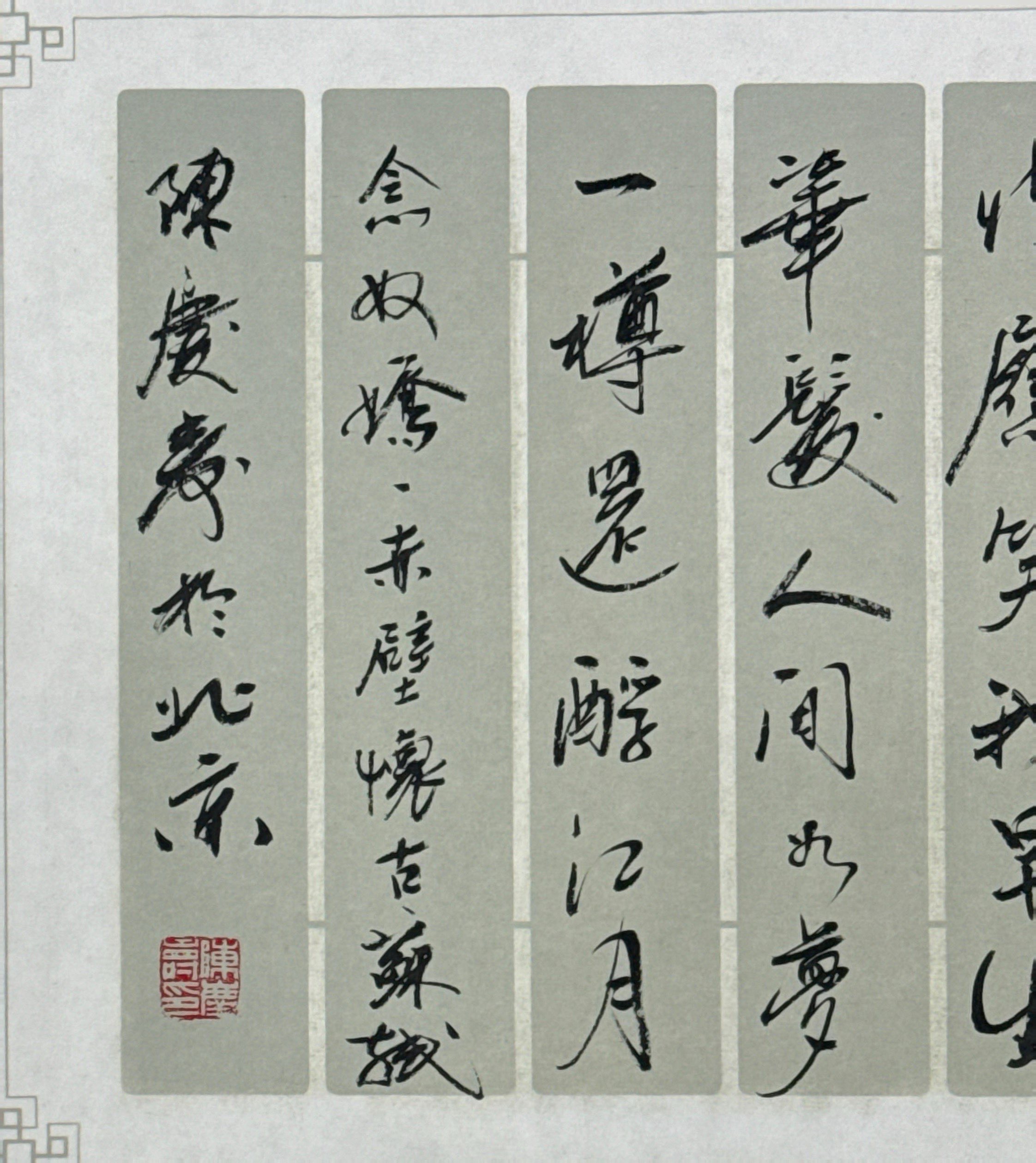 在章法布局邏輯上,長卷采用“分段式條屏組合”的形式:將《水調(diào)歌頭》與《念奴嬌·赤壁懷古》兩篇詞作分置于連續(xù)的條屏中,每屏字數(shù)均勻,字間距、行間距疏密得當,既遵循了傳統(tǒng)長卷“氣脈貫通”的審美,又通過條屏的分割強化了文本的段落感。落款“陳慶壽于北京”與朱文印章落于卷尾,既平衡了畫面的視覺重心,又延續(xù)了“書、印一體”的傳統(tǒng)范式;整體墨色濃淡均勻,筆畫粗細變化自然,體現(xiàn)了書寫時的節(jié)奏把控——開篇“明月幾時有”用筆舒緩,至“大江東去”處筆力漸強,與詞作情感的起伏形成呼應(yīng),讓章法不僅是形式布局,更是情感表達的載體。