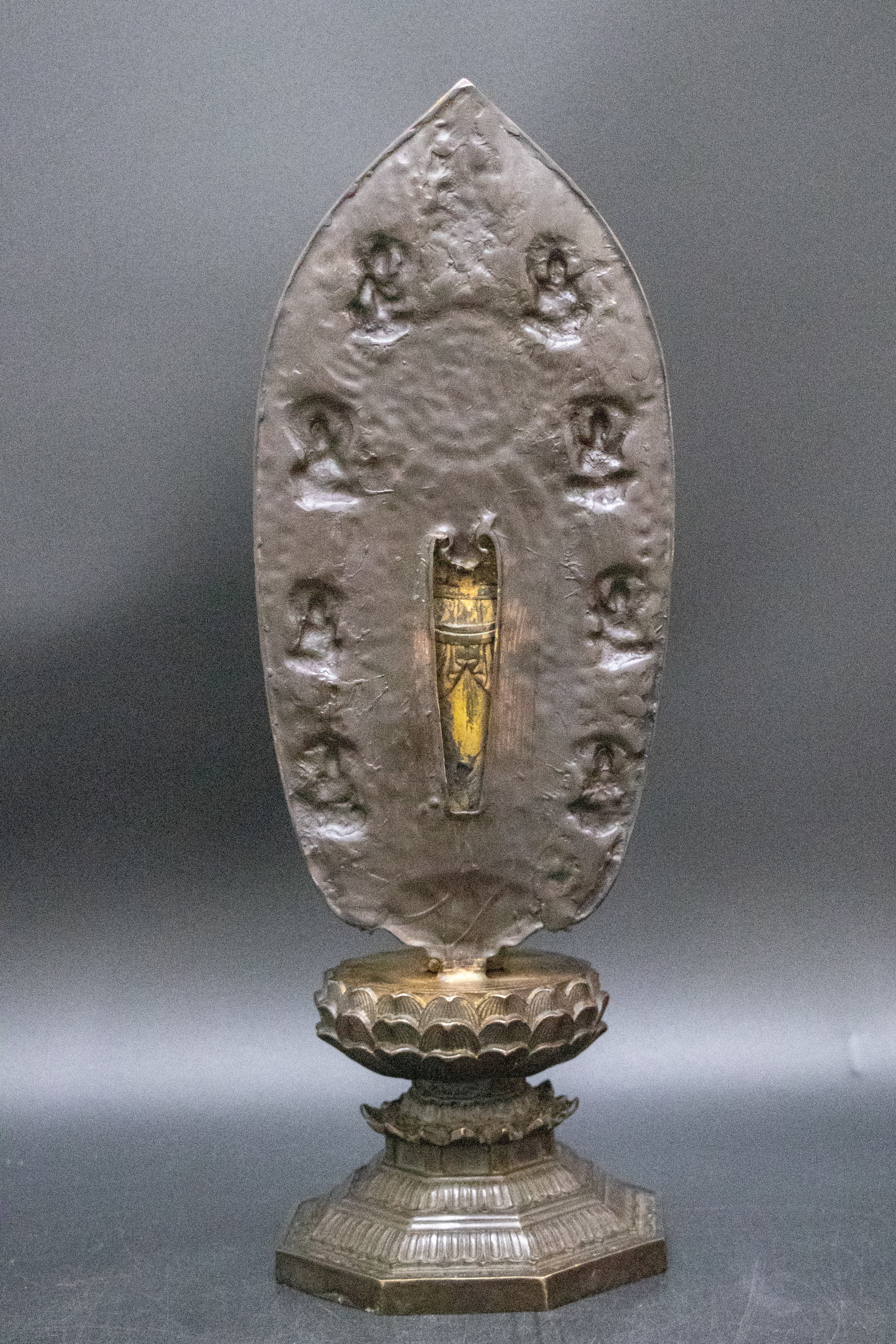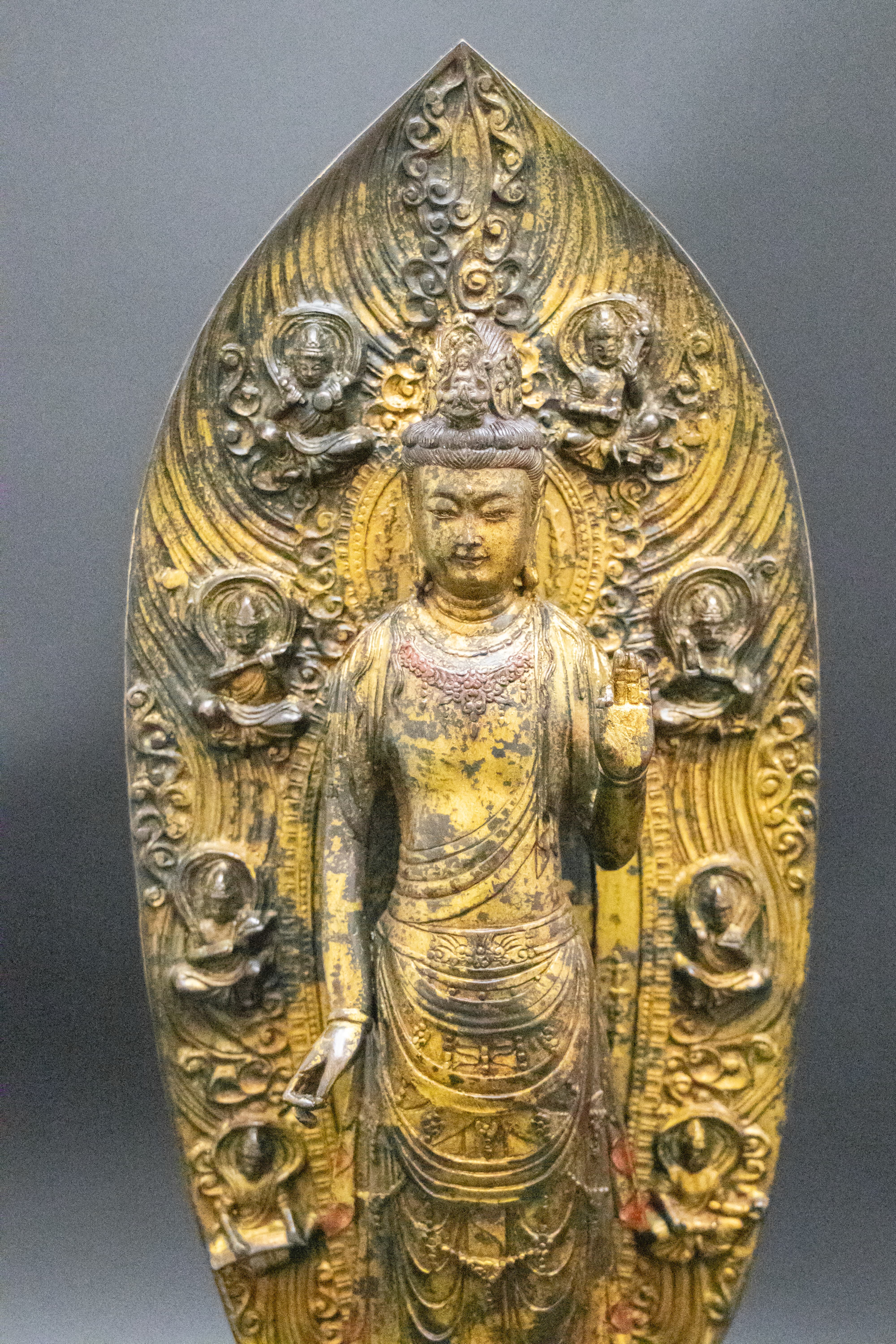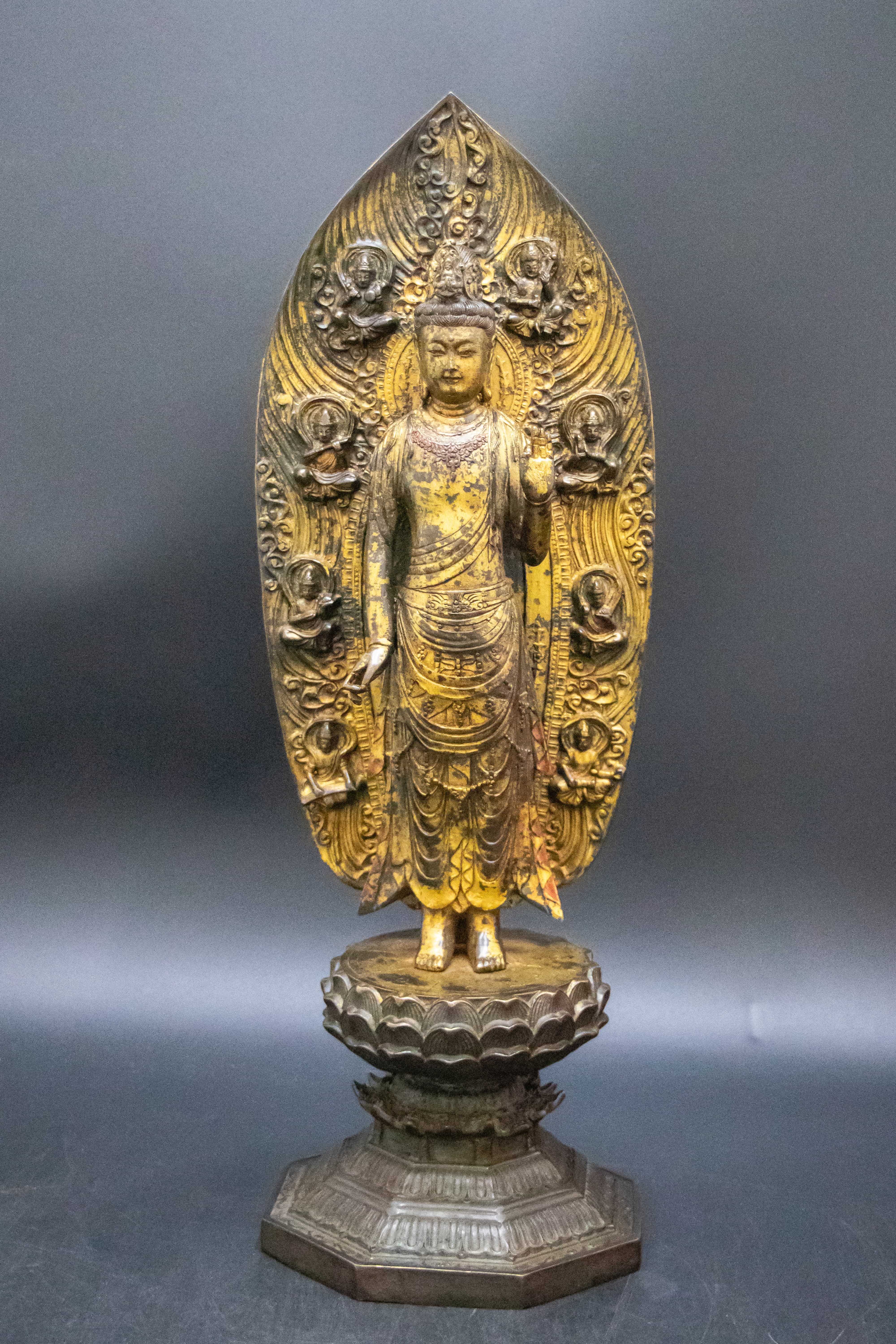 此像為“觀音立像”,搭配背光與蓮臺,符合明代宮廷佛教造像的規(guī)范:觀音身披天衣,衣紋流暢自然,右手施“與愿印”(手掌向外)、左手下垂施“施無畏印”,是觀音“救苦救難”的經(jīng)典法相;背光之上浮雕七尊化佛(觀音“七化佛”造像,對應(yīng)《法華經(jīng)》中觀音的慈悲示現(xiàn)),化佛神態(tài)各異、衣飾規(guī)整,既強(qiáng)化了造像的神圣性,也體現(xiàn)了對佛教儀軌的嚴(yán)格遵循——這類“主尊+化佛背光”的組合,是明代宣德時(shí)期宮廷造像的典型樣式。