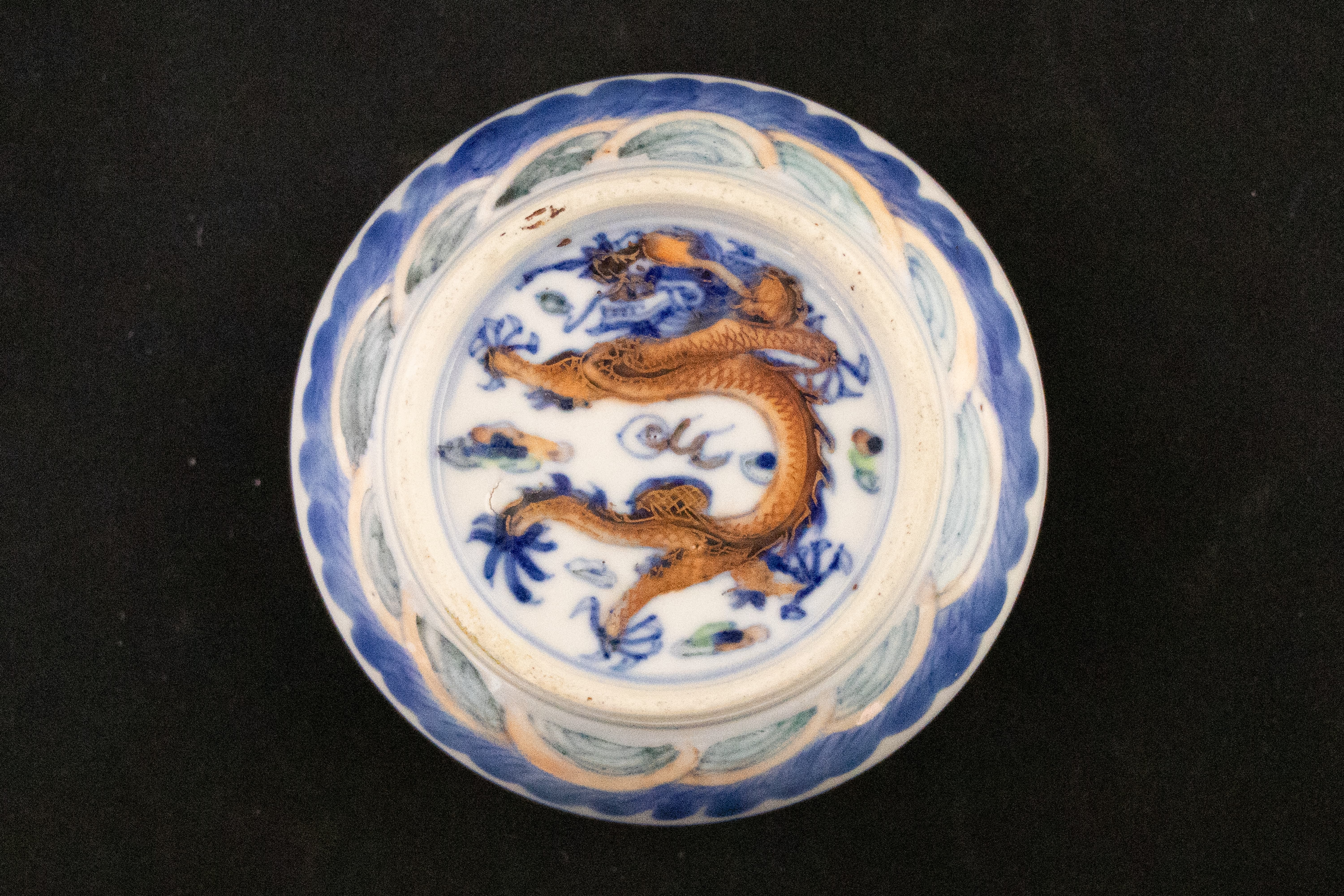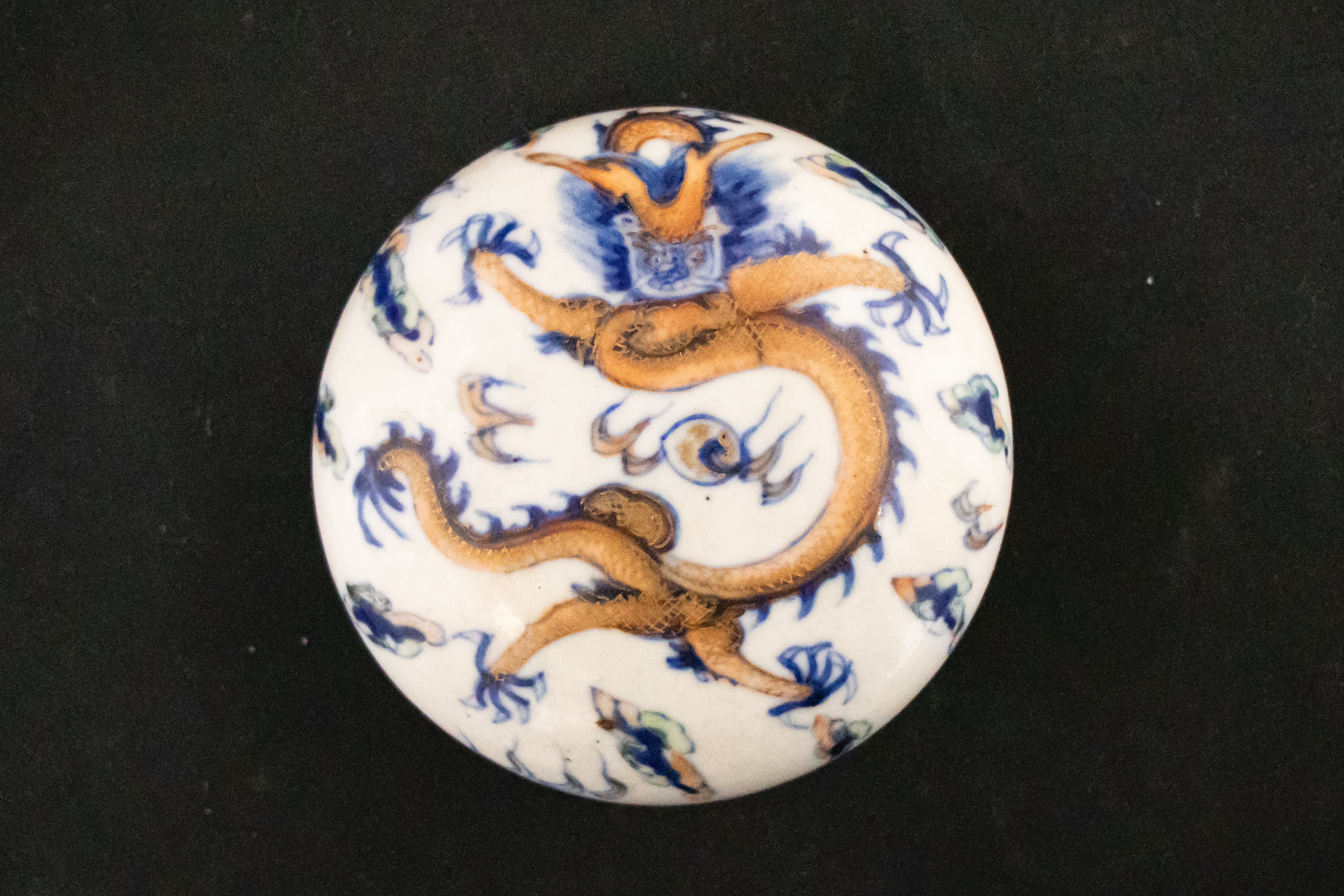 這件印泥盒不僅是一件實用的文房用品,更是一件藝術品。其龍紋圖案寓意吉祥如意、權力尊貴,體現了中國傳統(tǒng)文化中對龍的崇敬之情。青花與釉上彩的結合,使得畫面色彩豐富而不失雅致,線條流暢而富有動感。整體造型圓潤飽滿,手感舒適,既適合日常使用,也適合作為收藏品欣賞。