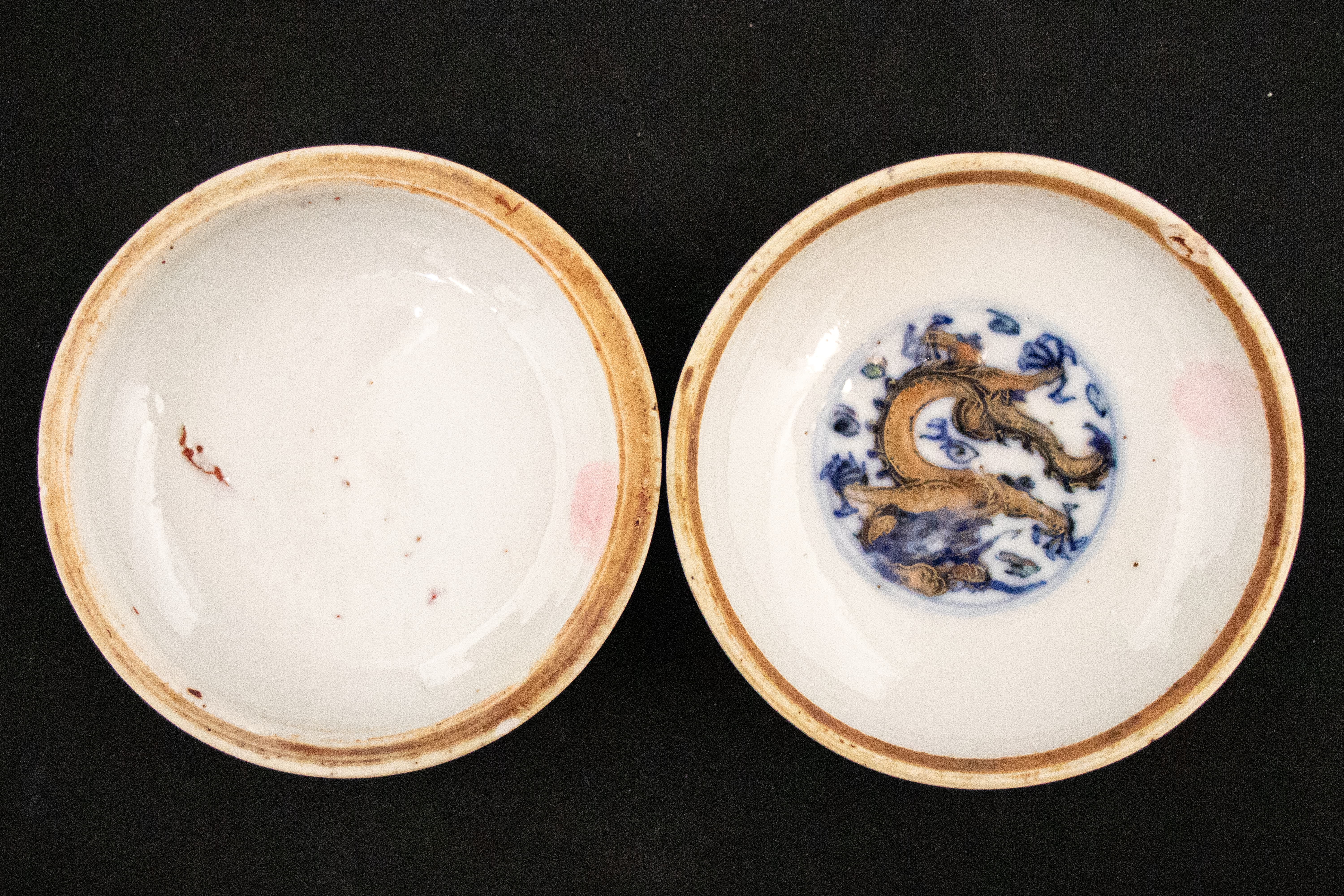 晚清時期的龍紋印泥盒,其設計精美,工藝精湛,展現了當時陶瓷藝術的高超水平。印泥盒整體呈圓形,表面以青花和釉上彩相結合的方式繪制了一條栩栩如生的龍紋圖案。龍身盤旋,姿態(tài)威猛,龍鱗細膩,龍須飄逸,周圍點綴著祥云和火焰紋樣,象征著吉祥與權威。